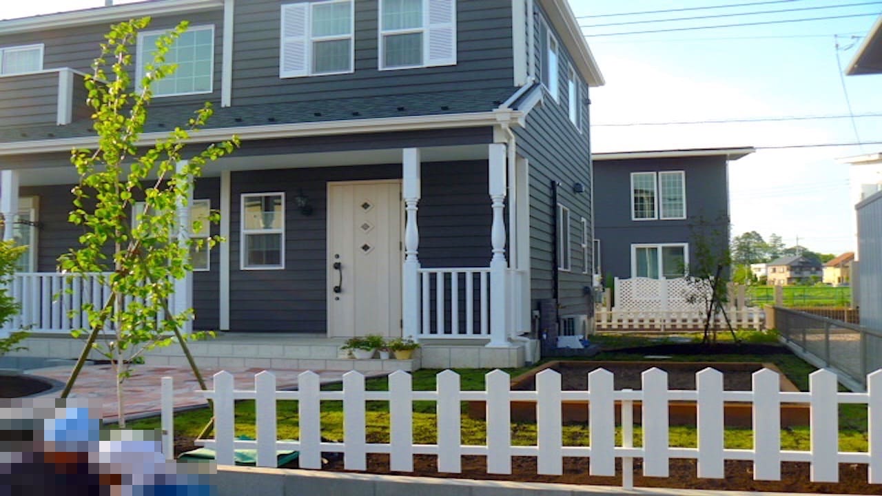 埼玉県川越市の外構エクステリア工事。アメリカンハウスの敷地を、白いガーデンフェンスで囲った施工例です。庭には芝張りと枕木の花壇をつくりました♪アメリカンな家がすごくかっこよく、それにうまく合わせた工事です!