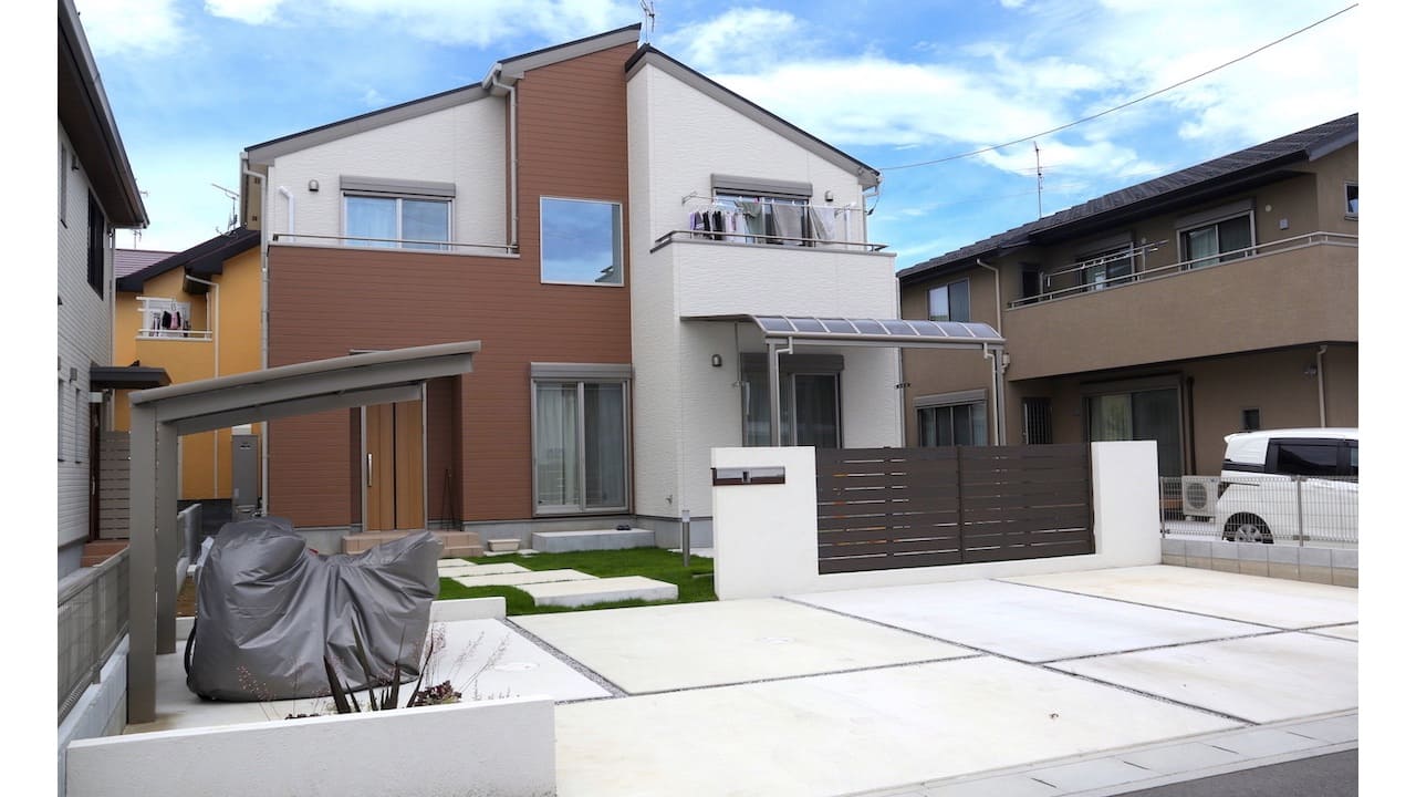 広々とした駐車スペースは使い勝手が良く、サイクルポートに自転車やバイクを駐車できます。リビング前にはテラスを作り屋根を設置し、道路からの視線カット目的で門柱に目隠しフェンスを施工しました。